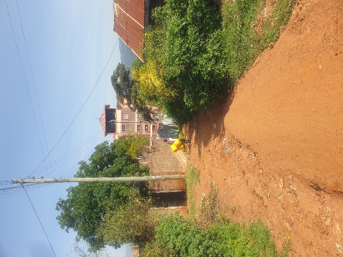 A dirt road curves slightly uphill, lined with foliage. A multi-story building with a red roof stands at the end of the path, partially obscured by trees. An electrical pole with wires stretches across the foreground. To the left, a stone structure is visible. A person in yellow attire is further up the path. Part of a rusty roof can be seen at the top. The sky is bright blue.