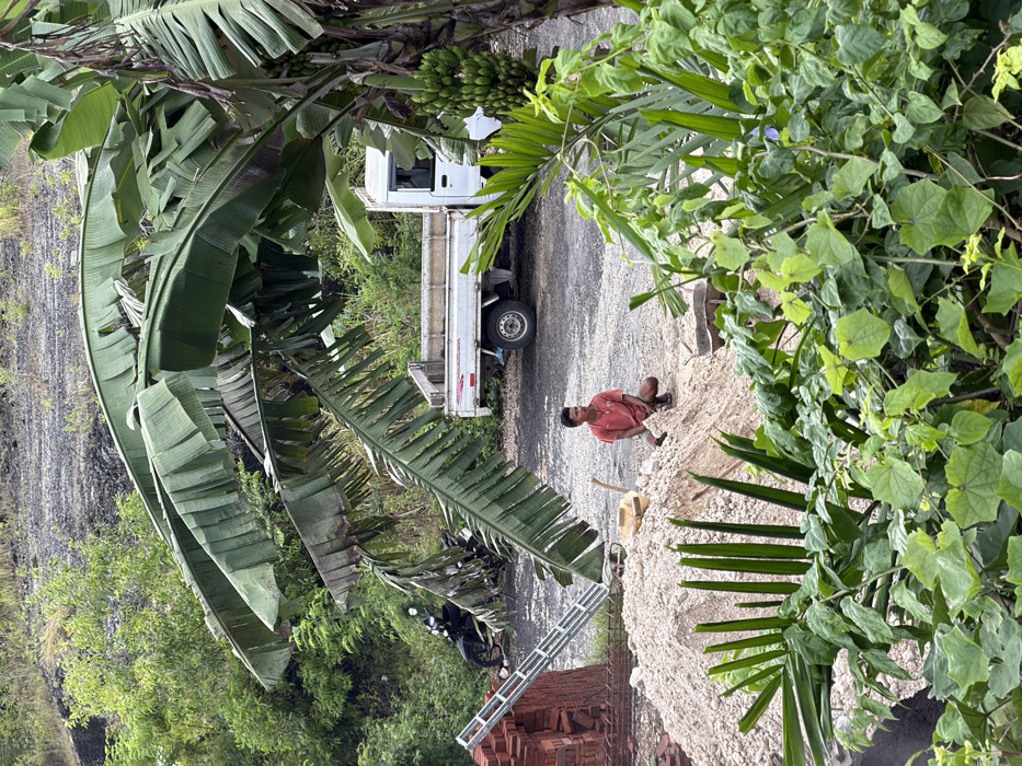 A person sits near a pile of sand, beside which are bricks and a ladder, possibly for construction. A white truck is parked on the road behind them. Lush green banana leaves and other foliage surround the scene, creating a jungle-like setting. The image is taken from a higher vantage point, looking down towards the road.
