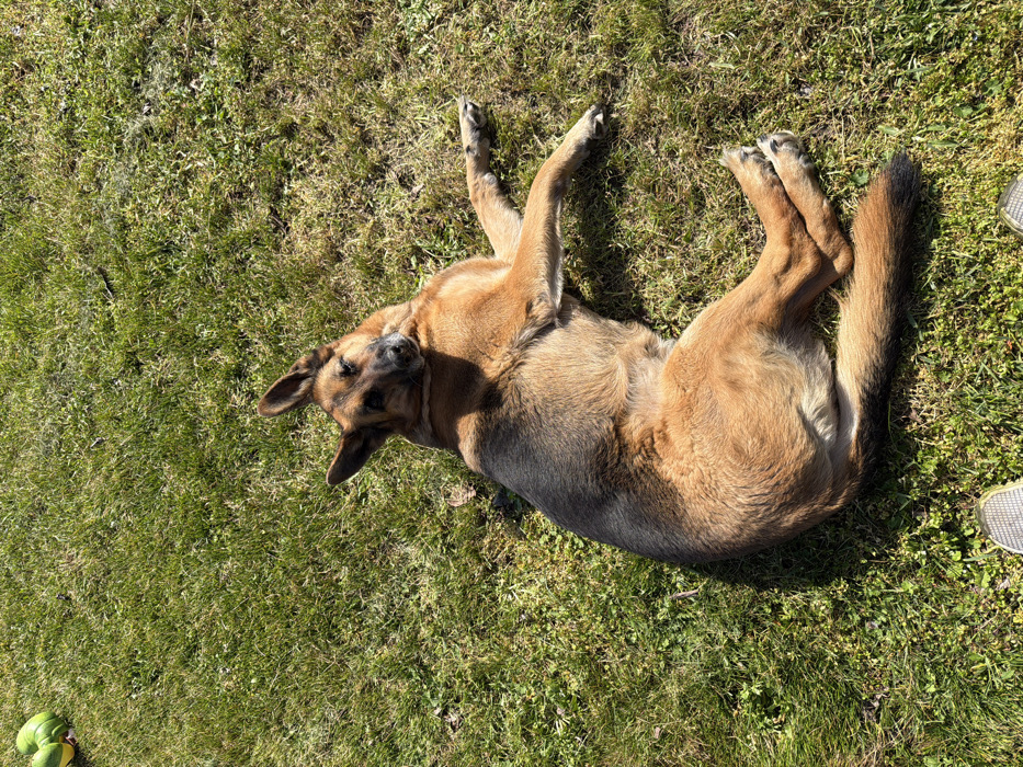 - "The scene, located in Rupkite, Bulgaria, depicts a medium to large-sized German Shepherd dog lying on its right side on a green grass lawn under direct sunlight" by FM-up5lz2, licensed under CC BY 4.0