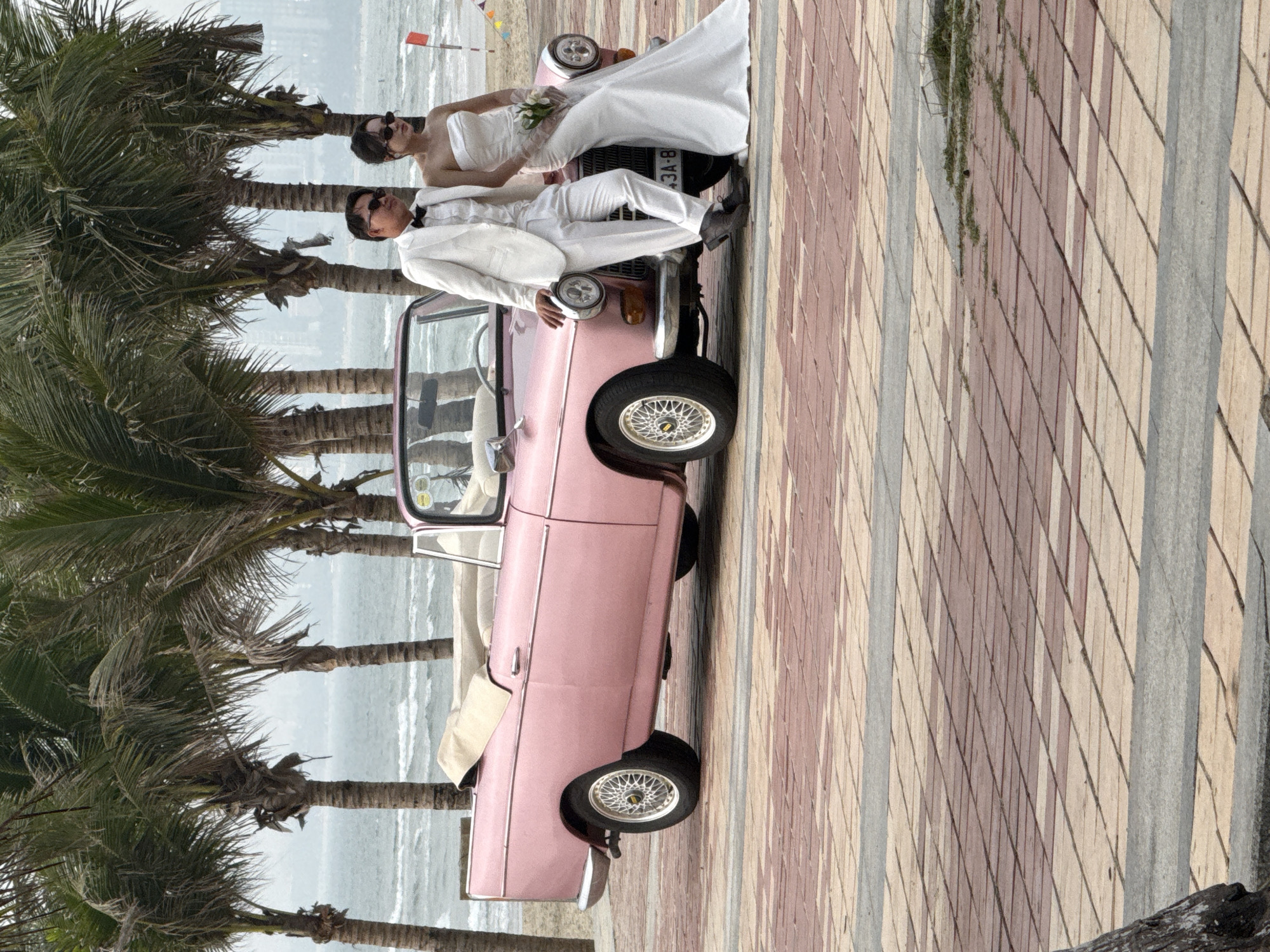 Two individuals in wedding attire are posing with a vintage pink convertible car on a paved promenade in Đà Nẵng, Vietnam