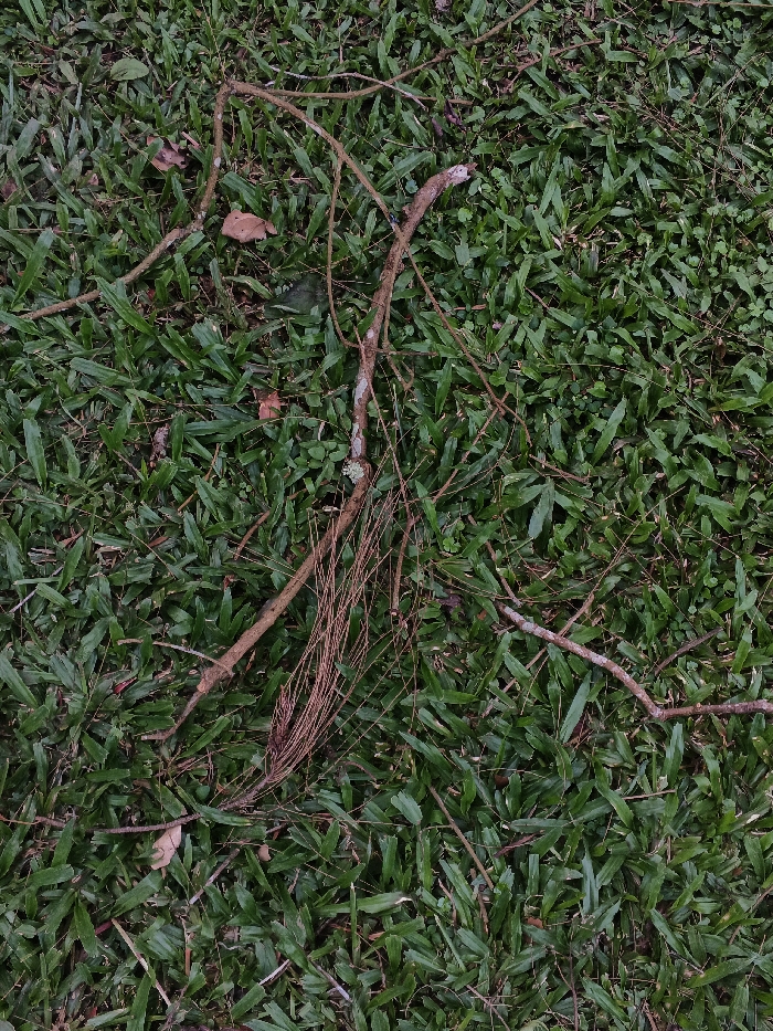Green grass covers the ground, interspersed with fallen twigs and branches of varying thickness. A cluster of dry, brown pine needles lies entangled with one of the branches. Small brown leaves are also scattered among the grass blades. The scene depicts a natural, slightly unkempt outdoor environment.