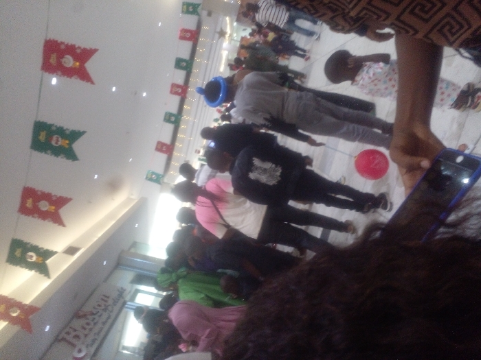 The image depicts an indoor scene within a bustling shopping mall located in Lagos, Nigeria, specifically likely at Ikeja City Mall due to the visible "Blossom by Delight" storefront. The environment features a high white ceiling illuminated by recessed lights, from which numerous red and green pennant banners with white festive motifs are strung, along with strands of small decorative lights further in the background, indicating a holiday or festive period. The floor is light-colored and tiled. A diverse crowd of people, including adults and children, occupies the space. In the immediate foreground on the left, the shoulder and back of a person with dark, curly hair are visible, along with their hand holding a black smartphone horizontally in a blue case. Towards the mid-ground, numerous individuals are present. A person in a pink top and dark pants is partially visible, facing away from the camera. Nearby, another person wears a green garment, possibly a dress or abaya. A person in a black sweatshirt with a white graphic design on the back stands near a red balloon resting on the floor, attached by a string. Adjacent to them, a person in a grey top and grey pants wears a distinctive blue balloon twisted into a hat-like shape on their head. To the right, a small child in a white patterned shirt and dark pants stands, looking downwards or to the side, with one hand near their face. Further into the background, a large number of other individuals are visible, some standing, some appearing to move, contributing to the crowded atmosphere.