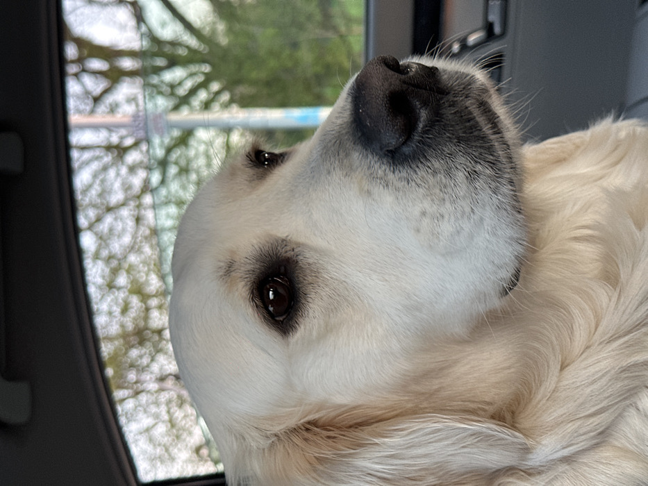 The image displays a close-up, profile view of a light-furred Golden Retriever dog situated inside a vehicle in Brentwood, United Kingdom