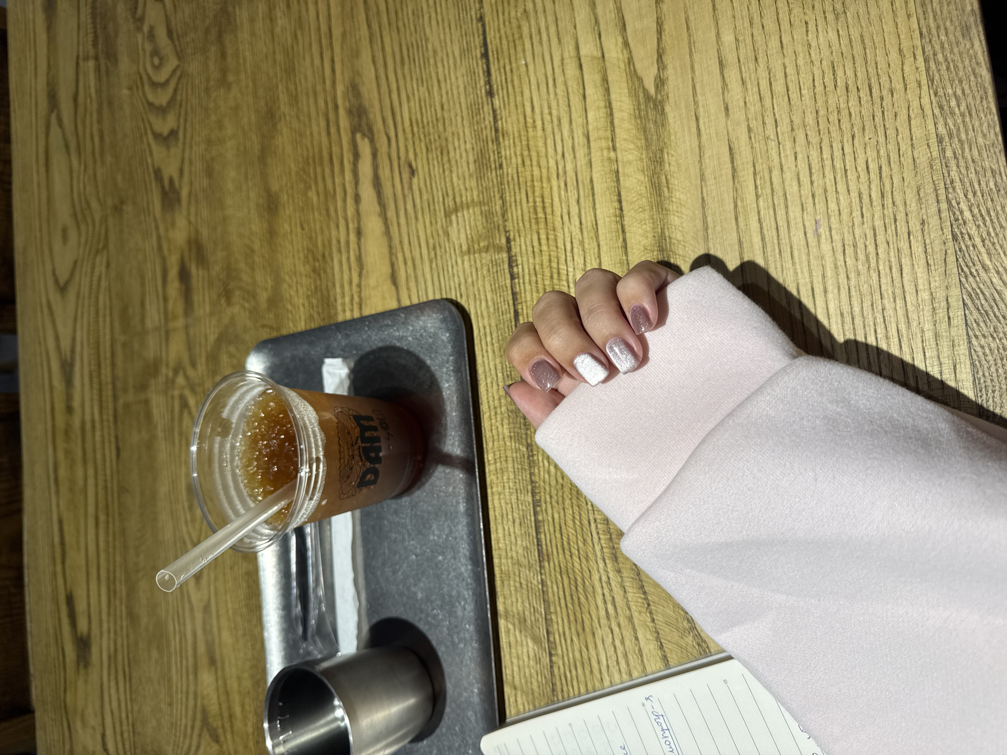 The image presents an overhead, close-up view of a wooden table surface inside "DAM Coffe & Tea" at 400 Thống Nhất, Phường Phước Long, Thành phố Nha Trang, Khánh Hòa, Vietnam. A grey rectangular serving tray is positioned in the upper left, holding a clear plastic cup containing an amber-colored iced beverage with foam and a clear plastic straw. The cup features a logo with a stylized animal head above "DAM" and "400" below. Adjacent to the drink on the tray is a small, empty silver metallic cup, with a white paper napkin partially visible underneath. In the lower-left, an open, ruled notebook displays handwritten text, including "world cup" and Vietnamese script. A person's left forearm, covered by a light pink long-sleeved garment, extends from the lower-right. The visible left hand has manicured nails: the index and ring fingers are painted in sparkly white/silver, while the middle, pinky, and partially visible thumb nails are painted in sparkly brown/taupe. The table exhibits a prominent light brown wood grain pattern.