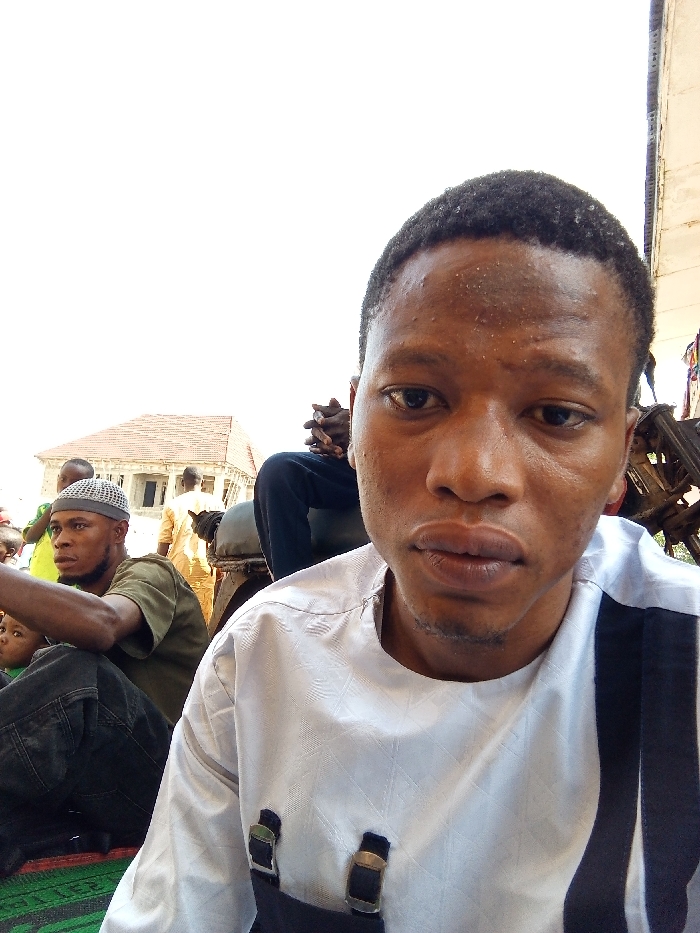 A close-up portrait depicts a dark-skinned male with short, dark, textured hair, wearing a white patterned long-sleeved garment featuring black trim and two black straps with silver buckles on the chest. He faces directly forward. To his left in the midground, another dark-skinned male wears an olive-green shirt, dark trousers, and a light-colored knitted skullcap, seated on a patterned mat and looking left. A child in a green garment is partially visible adjacent to him. The background features a light-colored building with a reddish-brown tiled roof, indicative of ongoing construction or renovation. A partially visible individual with clasped hands and dark trousers is situated to the right of the primary subject. The scene is outdoors under a uniformly bright, possibly overcast, sky. This event is located in Aramoko, Nigeria.