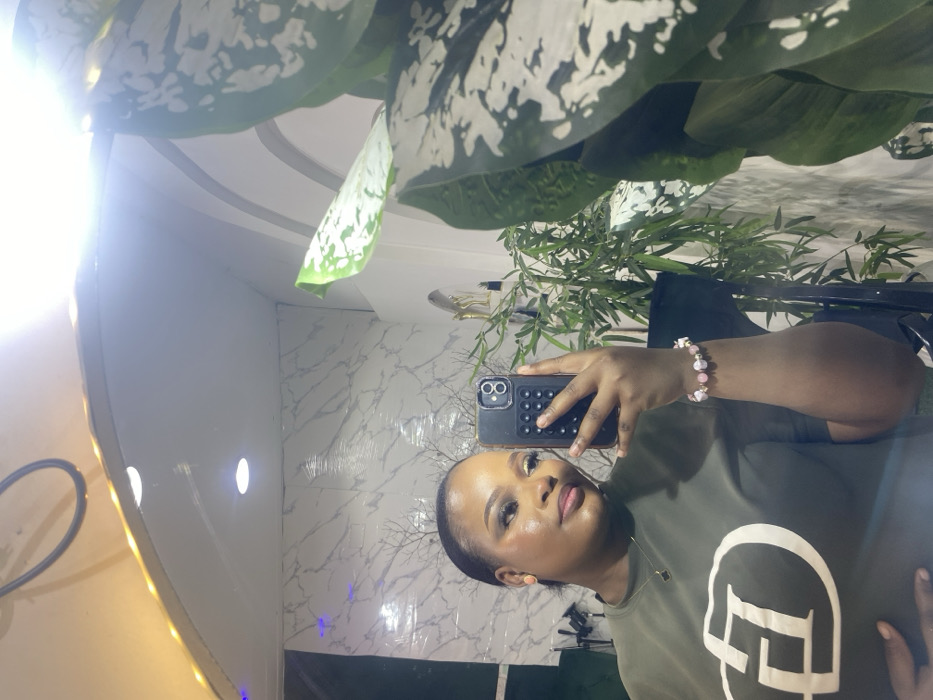 - "An interior mirror selfie in Nyanya, Nigeria, features a woman with dark skin, wearing a dark olive-green t-shirt with a white stylized 'LD' or 'GL' logo, a delicate necklace, and a multi-colored beaded bracelet on her left wrist" by FM-7ENGr1, licensed under CC BY 4.0
