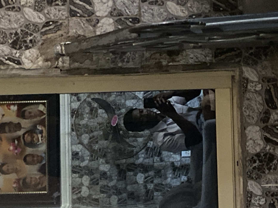 The image depicts a reflection in a rectangular glass surface, likely a window or mirror, within a structure in Sabon Tasha, Nigeria