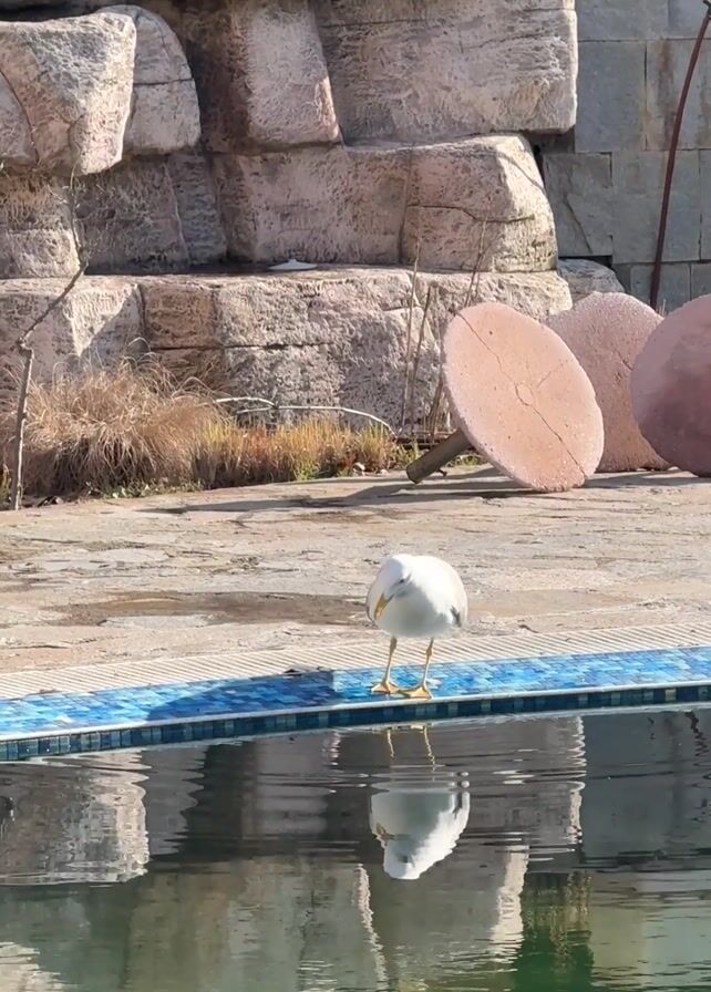 A seagull stands on the edge of an empty swimming pool, with its reflection visible in the dark water. The pool's edge is adorned with a blue tile border. Behind the pool are three round, flat objects and a backdrop of gray rocks stacked to resemble a small cliff. The scene is illuminated by sunlight.