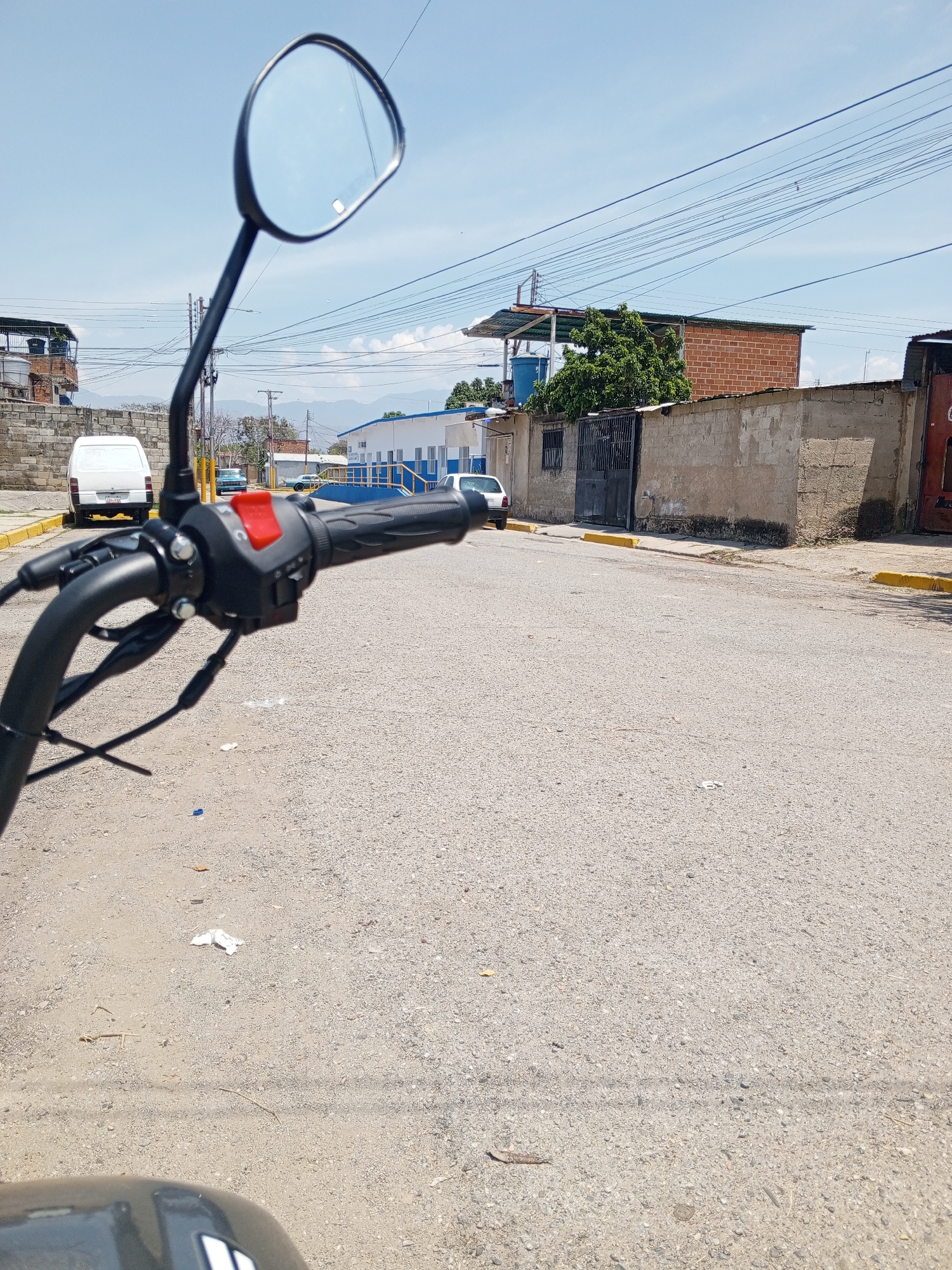 The image presents an urban street scene in Santa Rita, Venezuela, captured from the first-person perspective of a motorcycle. The immediate foreground features the black handlebar of a motorcycle, with a black grip and a red engine kill switch prominently visible on the right side. A black, oval rearview mirror, reflecting a clear blue sky, is positioned in the upper-left quadrant. The upper portion of the motorcycle's dark gray fuel tank with a white stripe is partially visible at the bottom edge. The street itself is a light-colored asphalt or gravel surface, exhibiting scattered debris, including a crumpled white object and a small blue item. Yellow-painted curbs delineate the edges of the road on both sides. To the left, a light-colored concrete block wall parallels the street. Behind this wall, a white panel van, possibly a Suzuki Carry, is parked facing away from the viewer. Further along, structures with a mix of brick and concrete construction are visible, including a building with a blue water tank situated on a metal frame roof. A dense array of overhead power lines crisscrosses the sky above these structures. Distant mountains are discernible on the horizon beneath a clear, bright blue sky. On the right side of the street, an older, stained concrete block wall runs parallel to the road. Behind this wall, a building with red brick construction and a visible metal roof is present. Further down the street, a building with distinctive blue and white painted exterior walls and blue railings is visible, with several parked vehicles, including a light-colored sedan and a white car, in front of it. The overall illumination indicates a sunny daytime environment.