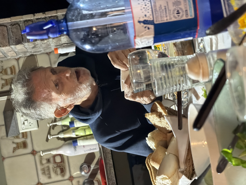 An older man with gray hair and a blue hoodie is visible near a table laden with bread, glasses, and a large water bottle. The table appears to be set for a meal, with plates and cutlery also present. The background includes a tiled wall with decorative elements and rows of smaller bottles or containers. The image is slightly tilted, giving a unique perspective.