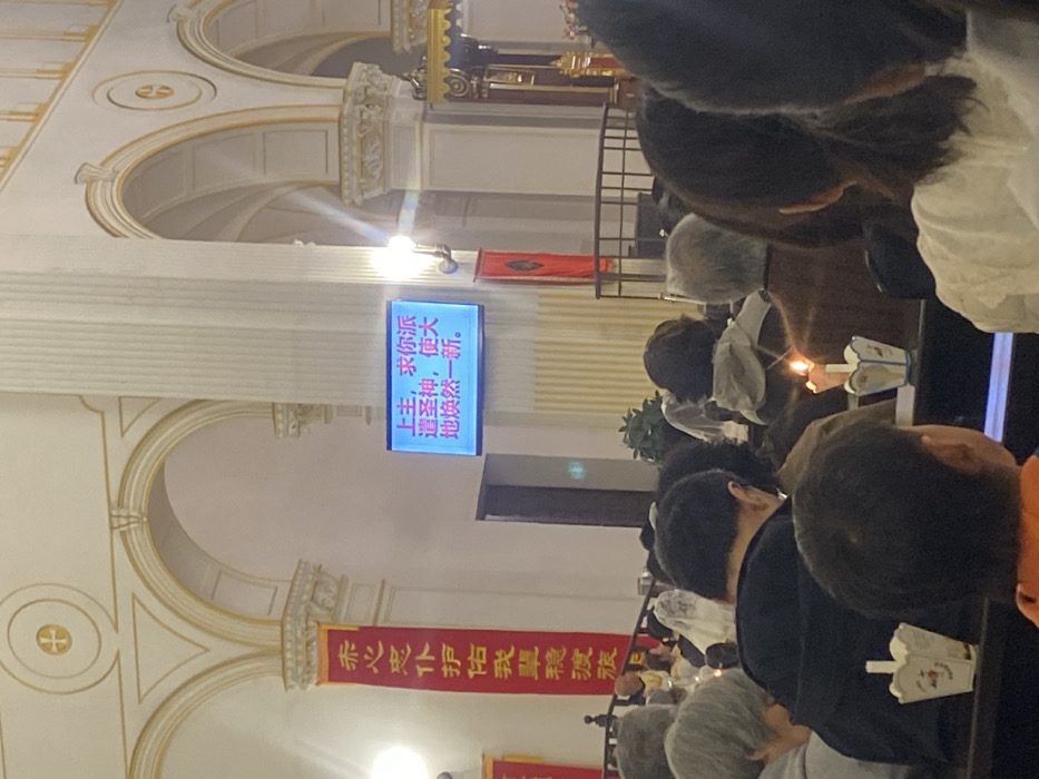 n interior scene in the St. Michael's Cathedral, Qing Dao Shi, China, located at latitude 36.068 and longitude 120.315. The scene depicts a congregation of people seated in pews during a service, with a lit candle in a small white holder in the foreground, and a screen displaying text in Chinese on the right wall. The interior is adorned with ornate white arches and pillars, with red fabric banners hanging on the left wall. The light shines brightly through the arched windows, illuminating the space. The congregation faces the front of the cathedral, which is not visible in the image. There are several people in the pews, most wearing white shirts, and several women wearing white lace veils. The image focuses on a man in the middle of the pews, wearing a dark jacket, with his head down as if in prayer. His back is to the camera. The image was taken during a service in the cathedral, and the scene is peaceful and reverent.