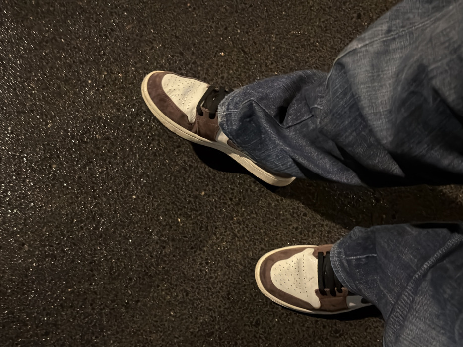 Two brown and white sneakers stand on a dark, slightly wet surface. The shoes have a white upper with a brown suede overlay and black laces. Blue jeans are draped over the sneakers, with the fabric pooling around the ankle of the top shoe. The surface reflects some light, giving it a glistening appearance. The overall perspective is from above, looking down at the shoes and the ground.