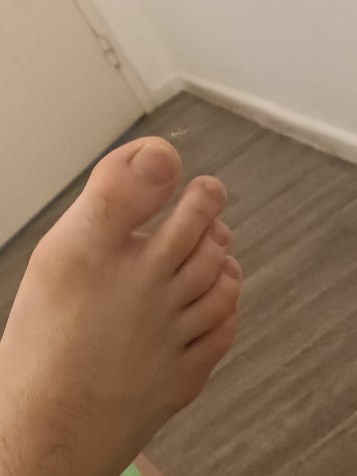 A close-up shot shows a human foot with visible toe hairs. The toes are slightly curled and pressed together. The background consists of wood-like flooring and a partial view of a white wall meeting the floor. The foot is pale in complexion with a hint of green visible underneath near the ankle.
