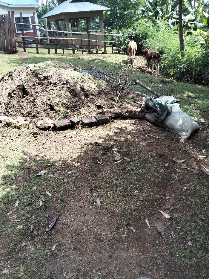 The image depicts an outdoor rural or semi-rural scene in Nyansiongo ward, Kenya, under natural daylight. In the foreground, the ground consists of exposed reddish-brown soil mixed with sparse green grass and scattered dry leaves. A large, dark mound of soil or compost dominates the left foreground. To the immediate right of the mound, four dark, rectangular blocks, resembling unfired bricks or compacted soil, are horizontally arranged. Further right, a substantial, bare tree branch or log lies horizontally. Adjacent to this, two large, light-colored woven sacks are positioned on the ground, with a smaller, darker green sack placed atop one of them. In the midground, beyond the foreground elements, two bovine animals are present. A light brown cow, with lighter underparts, is positioned on the left, facing away from the camera, with its head lowered to the ground as if grazing. To its right, a second cow, brown with white markings, also faces away, with its head lowered. Behind these animals, a rustic fence constructed from wooden posts and horizontal rails encloses an area. Within this fenced area, a small building with light-colored walls and a light blue corrugated metal roof is partially visible on the far left. Adjacent to this building is an open-sided wooden structure with a grey corrugated metal hip roof, resembling a gazebo or shelter. The background features dense, vibrant green foliage, including visible broad-leafed plants consistent with banana trees, along with various shrubs and trees. Shadows from unseen overhead vegetation are cast upon the foreground ground cover. No human figures are visible.
