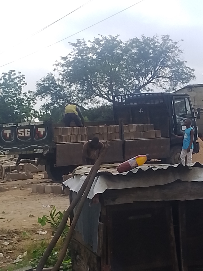 This image depicts an outdoor scene in Adankolo, Nigeria, featuring a dark-colored flatbed truck loaded with numerous light-colored rectangular blocks