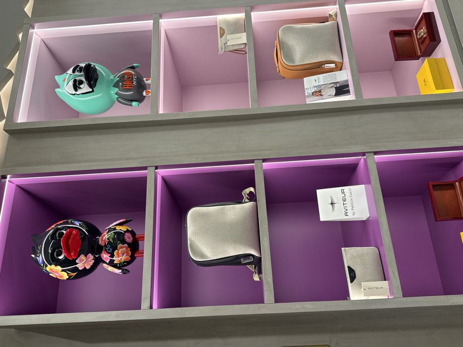 This image captures a retail display unit within a store in Dubai, United Arab Emirates. The unit consists of multiple recessed shelves framed by light grey partitions. The left column of shelves features vibrant purple back panels, while the right column has light pink back panels, all illuminated by white strip lighting along the top and bottom edges of each shelf opening. On the top-left shelf, a large black stylized duck-like figurine with a red beak and feet is displayed, adorned with a colorful floral pattern in shades of orange, pink, yellow, and blue. Below it, a black backpack with an off-white/beige front panel is positioned upright. The next shelf down features a small off-white/beige clutch or pouch with a white tag, placed next to a clear acrylic display stand bearing the white text "AVITEUR by Patricia Gucci" and a bird logo. The bottom-left shelf partially shows a reddish-brown wooden box. On the top-right shelf, a large stylized teal-green duck-like figurine with a dark beak and orange feet is displayed. This figurine wears a black vest emblazoned with "HRCHU NYC" in orange lettering. Below it, a small off-white/beige shoulder bag or clutch with a white tag is present. The next shelf down showcases a brown backpack with an off-white/beige front panel, standing upright. Beside the backpack is an open magazine or leaflet featuring a woman in a white top and dark pants, with visible "AVITEUR" branding. The bottom-right shelf displays a yellow box next to an open reddish-brown wooden box, which contains a gold-colored item, likely a watch or piece of jewelry. No people are visible in the scene.