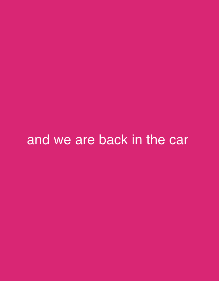 solid pink background with the text "and we are back in the car" centered horizontally and positioned in the lower half of the frame