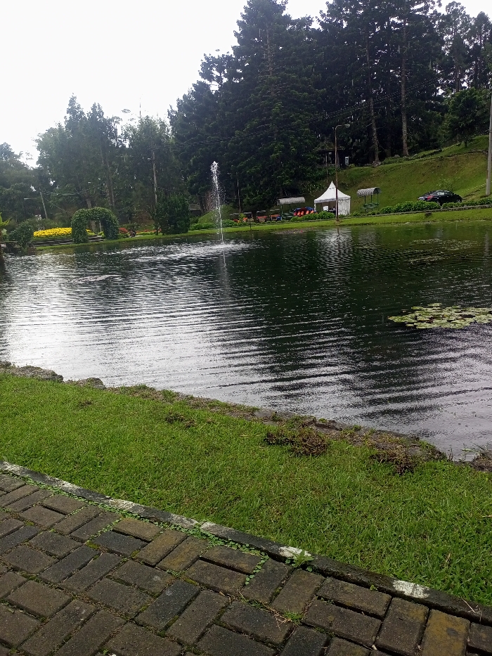 The image displays an outdoor park scene, identified as being in the city of Beni, Nepal. The foreground features a dark brick-patterned pathway, bordered by a strip of green grass, extending to a dark body of water. The water's surface exhibits ripples, and a fountain sprays water upwards from its central-left area. A cluster of lily pads is present on the water's right. Across the water, the background comprises a manicured grassy slope, ascending towards a dense forest of tall, dark green coniferous trees beneath an overcast sky. On the embankment, several structures are visible: a white canopy tent, two smaller covered shelters with assorted colored small boats or kayaks, and a green foliage-covered archway situated over yellow flowers. A black sedan is parked on a paved area on the upper right slope. A single street light pole is also present. No individuals are visible within the frame.