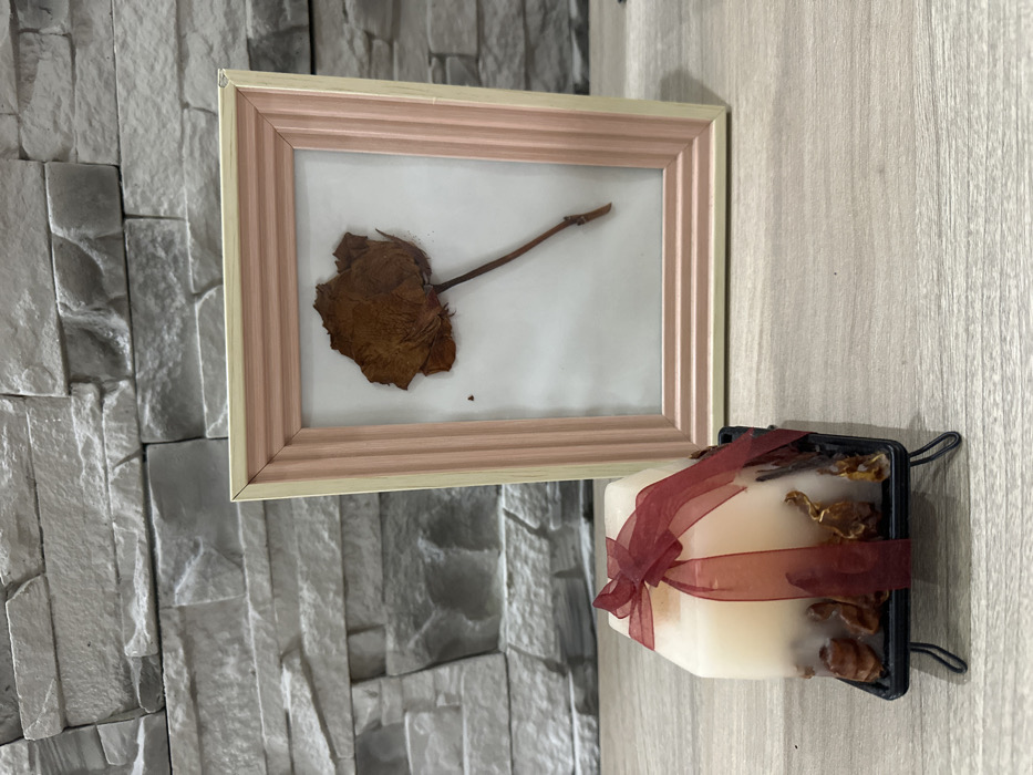 A framed, dried rose rests against a textured wall. The frame is light with a pink inner accent. To the right, a square candle sits in a black holder with metal loop handles. The candle is adorned with a maroon ribbon and various dried flower petals. The background alternates between the textured wall and a smooth, wood-grained surface. The composition feels still and decorative.