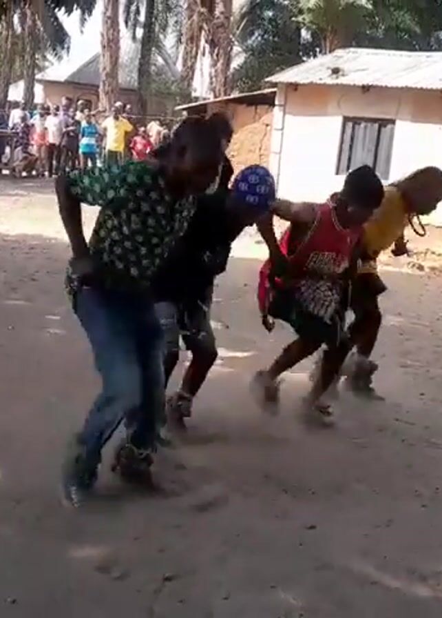 group of four young men engaged in a synchronized jumping dance on a dusty, dirt road. They are dressed in casual clothing, with one in a green patterned shirt and jeans, another in a black shirt, another in a red basketball jersey, and the last in a yellow shirt. The men move in unison, rhythmically raising their knees and heels in a type of shuffling step. A crowd of onlookers lines the sides of the road, observing the performance. Some are standing, while others are seated. In the background, there are simple buildings with corrugated metal roofs. Some trees are visible, providing partial shade. The scene takes place outdoors during the daytime, under natural sunlight. The overall impression is one of a community gathering and cultural performance.