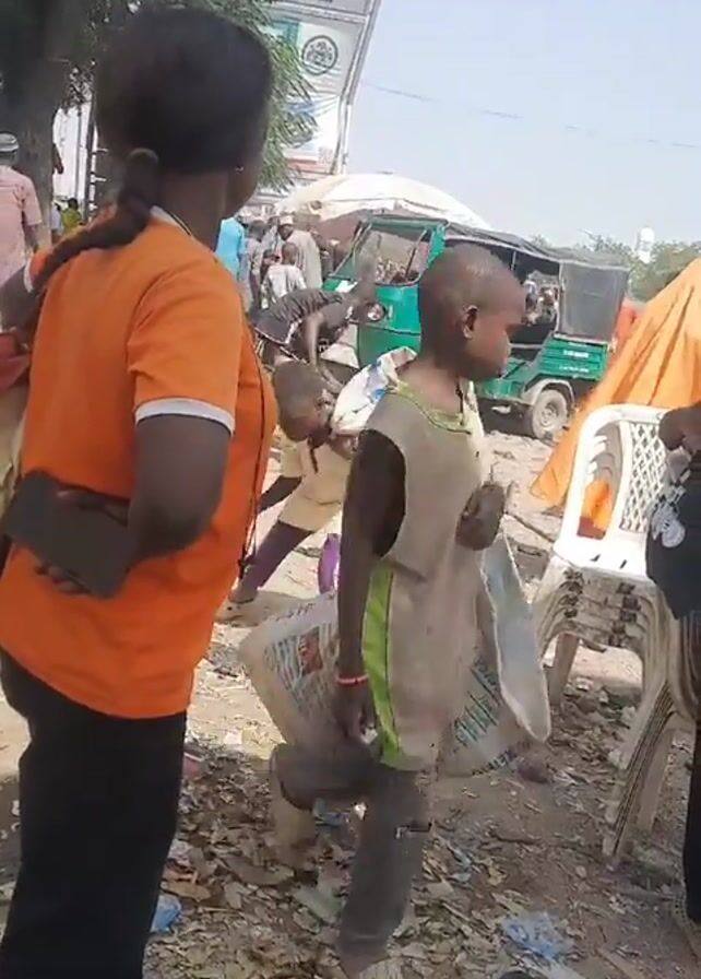 child carrying a large bag through a litter-strewn area. The child is walking from left to right, and is dressed in a light-colored top and purple pants. A person in an orange shirt and black pants stands with their back to the camera, watching the child. There is a green auto rickshaw behind the child. The ground is covered with litter, and there are a few chairs nearby. In the background, there are people and buildings.