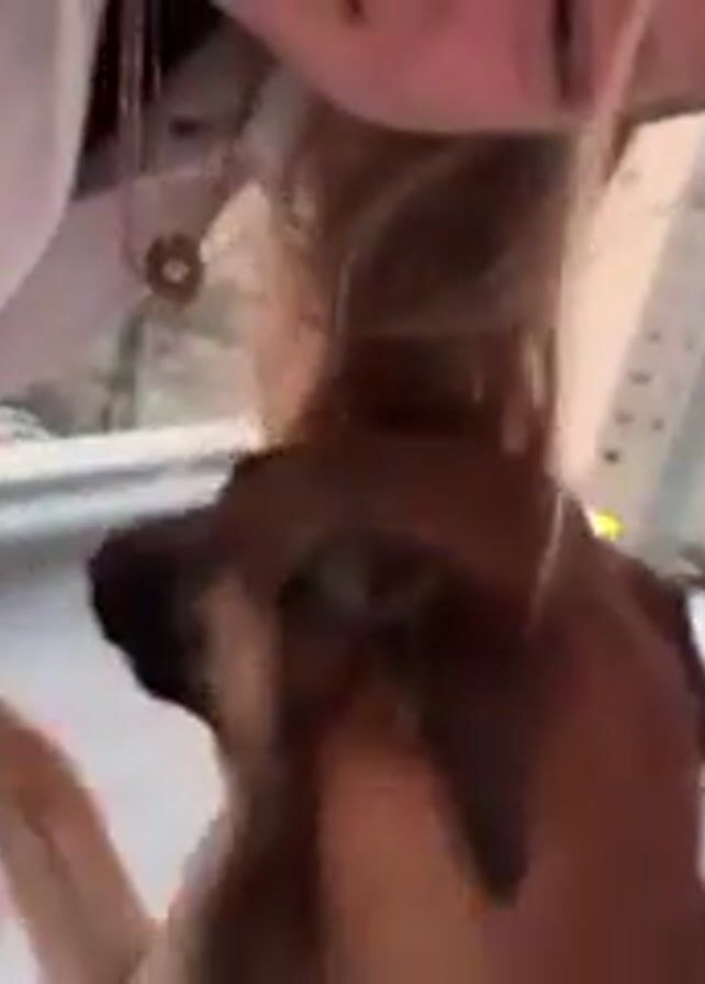 A woman pets a dog on a balcony. The camera is pointed down at the dog and woman. The dog is brown with black markings on its face. The woman is wearing a white jacket, black shirt and black pants. She stands in front of a white painted wall with a glass railing. Behind the railing is a city landscape. The camera moves around to follow the movements of the dog and woman.