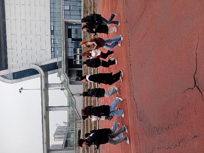 A group of people stand in a line on a red track outside of a building. The building is modern, tall, and covered in windows. The people are spaced out and appear to be talking or waiting. They wear a variety of clothing, including jeans, jackets, and sneakers. The sky is overcast and gray.