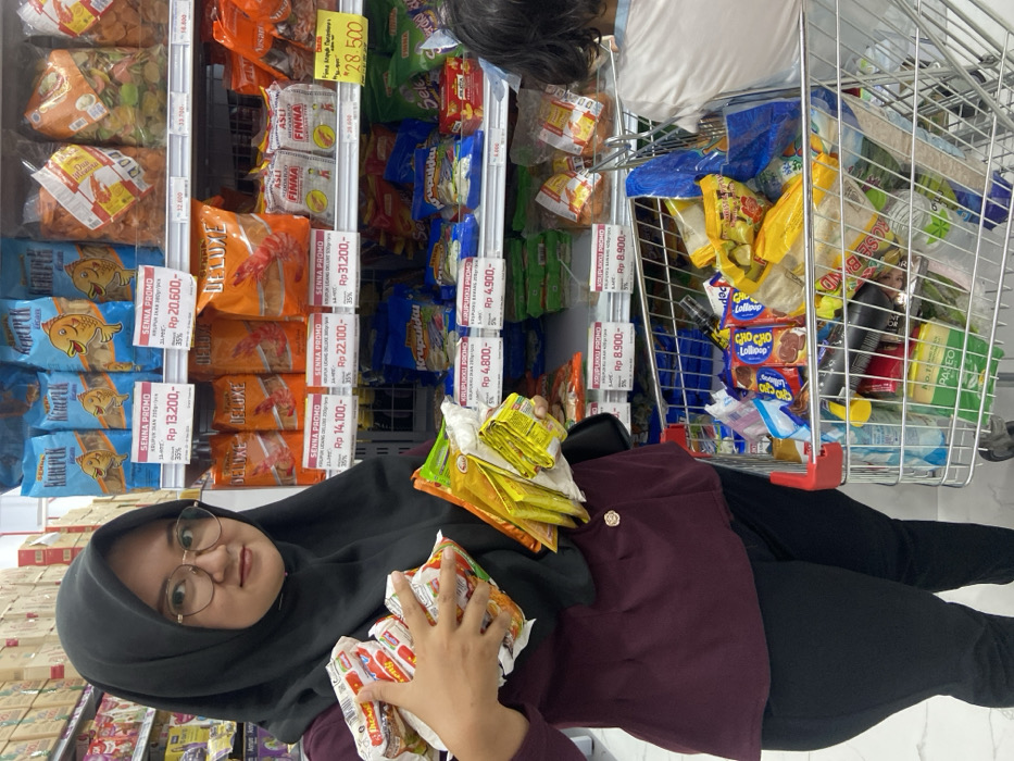 - "In a grocery store aisle, a woman wearing glasses and a black hijab holds stacks of packaged snacks" by FM-htxI33, licensed under CC BY 4.0