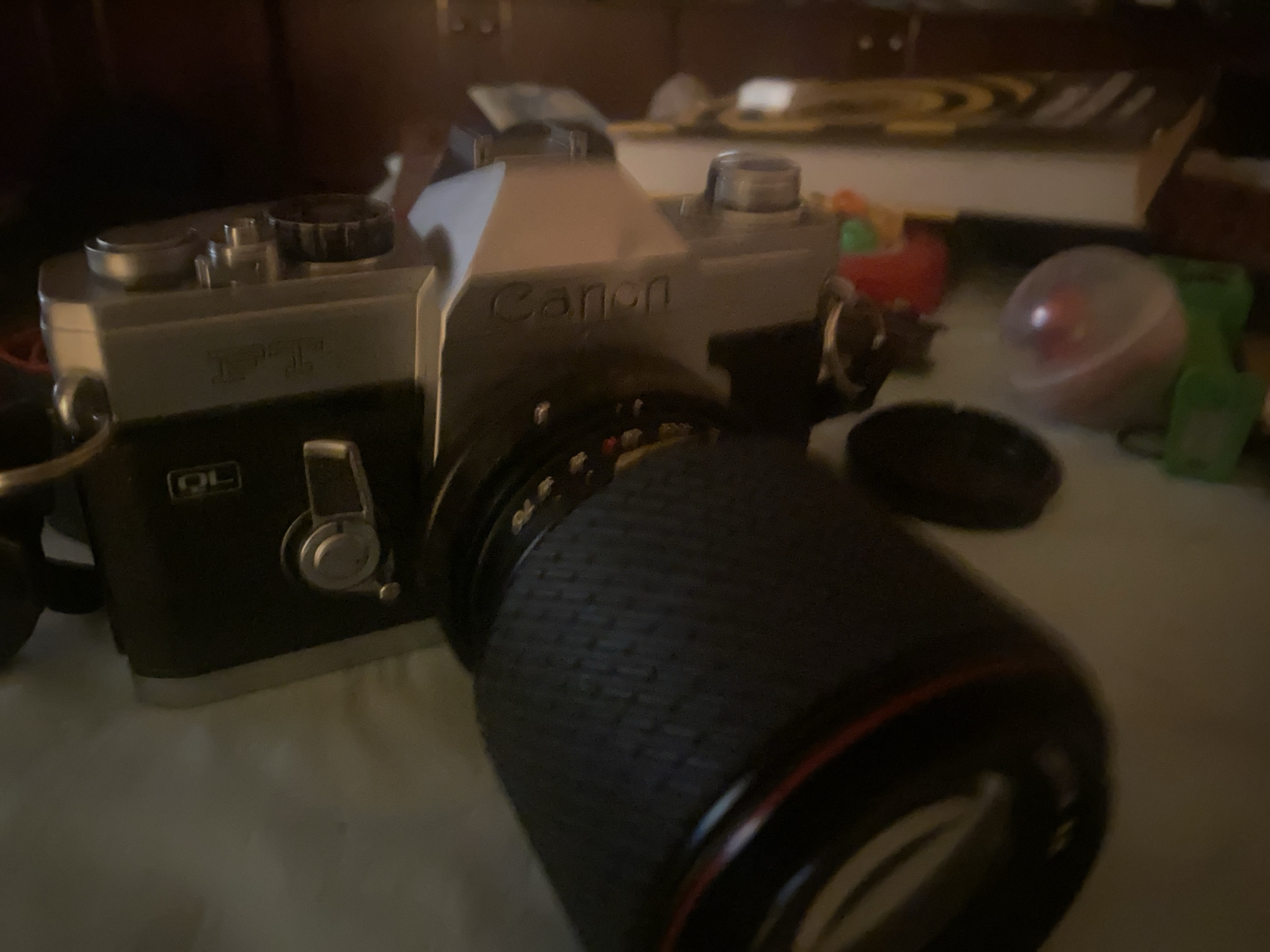 A vintage Canon FT QL single-lens reflex (SLR) camera, featuring a black body and a silver-colored top plate, is positioned in the foreground, angled to the right. The "Canon" branding is embossed on the pentaprism housing, and "FT" along with "QL" is visible on the camera's front left side. A long, black photographic lens with a textured grip ring and a thin red band near its front element is attached to the camera body. To the right of the camera, a circular black lens cap rests on the surface. The camera assembly is situated on a light-colored, textured surface exhibiting minor undulations. The background is out of focus, revealing several indistinct items including a red plastic object, a green plastic object, and a clear spherical plastic container with a red element inside. A blurred, flat object, potentially a book, is also partially visible in the far background. The scene is dimly lit, indicating an indoor environment. No individuals or specific actions are depicted. The exact location within the city of Sofia, Bulgaria, cannot be determined from the visual information provided.