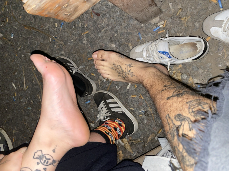 Two pairs of feet rest on a gravel-covered surface littered with cigarette butts. One foot is bare with a tattoo on the top, accompanied by a worn white Adidas sneaker. The other foot, also bare, is next to a black Adidas Campus shoe with a patterned sock. Both legs have tattoos; one leg also features tattered clothing. The lighting is dim, casting shadows on the scene. A wooden plank is visible in the upper portion of the image.