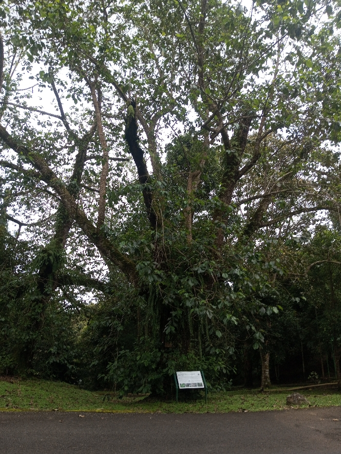 The scene is set in what appears to be a natural or park-like environment in the city of Kanand, India, dominated by a large, mature tree. The tree features multiple thick, gnarled trunks and extensive branches densely covered with green foliage, including discernible leaves, vines, and ferns growing on its bark. An informational sign with a white panel and a green border is positioned on a grassy slope to the right of the tree's base; its text and images are illegible due to distance. The foreground consists of a dark, paved surface, likely an asphalt pathway or road, bordered by short green grass. In the background, additional dense green foliage and tree trunks are visible, suggesting a wooded area. The sky, visible through the tree canopy, is bright and overcast, providing diffused lighting. No individuals or animate subjects are present, and no actions or interactions are occurring.