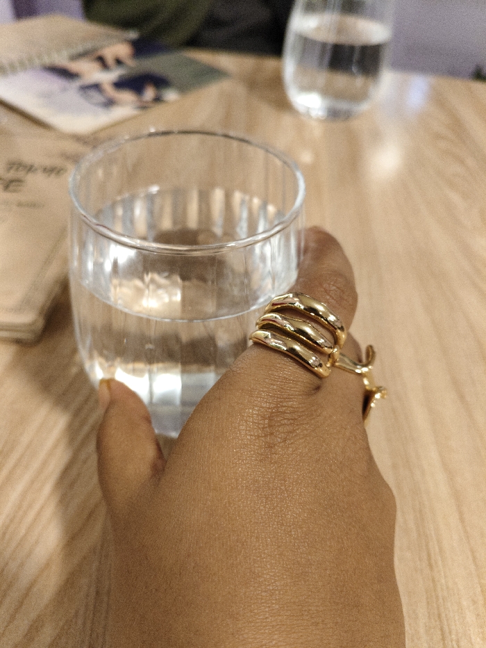 A human hand, displaying a medium brown skin tone, is captured holding a clear, vertically fluted glass containing water, approximately three-quarters full. The hand is adorned with multiple gold-toned rings, including a prominent, multi-band wavy ring on the index finger. The objects are situated on a light-colored wooden table exhibiting a horizontal grain pattern. In the mid-ground to the left, a beige booklet or menu is partially visible, featuring the text "Top 40" on its cover. The blurred background reveals an additional identical clear glass of water and an indistinct form with dark green fabric, suggesting another individual. The scene is set indoors, within "The Top 40" restaurant/lounge located at 12, 1st Floor, Dr UN Brahmachari Street, Mullick Bazar, Park Street Area, Kolkata, India.