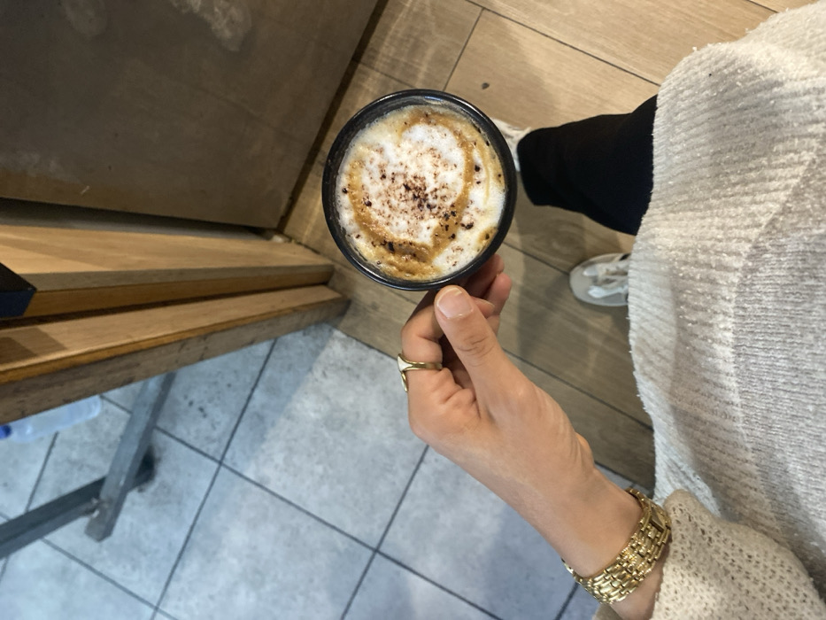 An overhead, downward-angled shot captures a person's upper torso, right arm, and lower legs in an indoor setting within Monastir, Tunisia. The individual holds a black mug filled with a coffee beverage featuring frothed milk, decorative latte art or syrup swirls, and dark sprinkles on its surface. The person wears a light-colored, textured knit sweater, black trousers, and light-toned athletic shoes on the visible right foot. A gold-toned link bracelet adorns the left wrist, and a gold-toned signet ring with a light-colored face is on the right ring finger. The floor exhibits two distinct sections: grey square tiles with dark grout lines on the left, and lighter brown wood-look plank flooring on the right. In the background, a wooden door frame or paneling is visible on the right, while a metal fixture and a clear plastic bottle are present on the left.