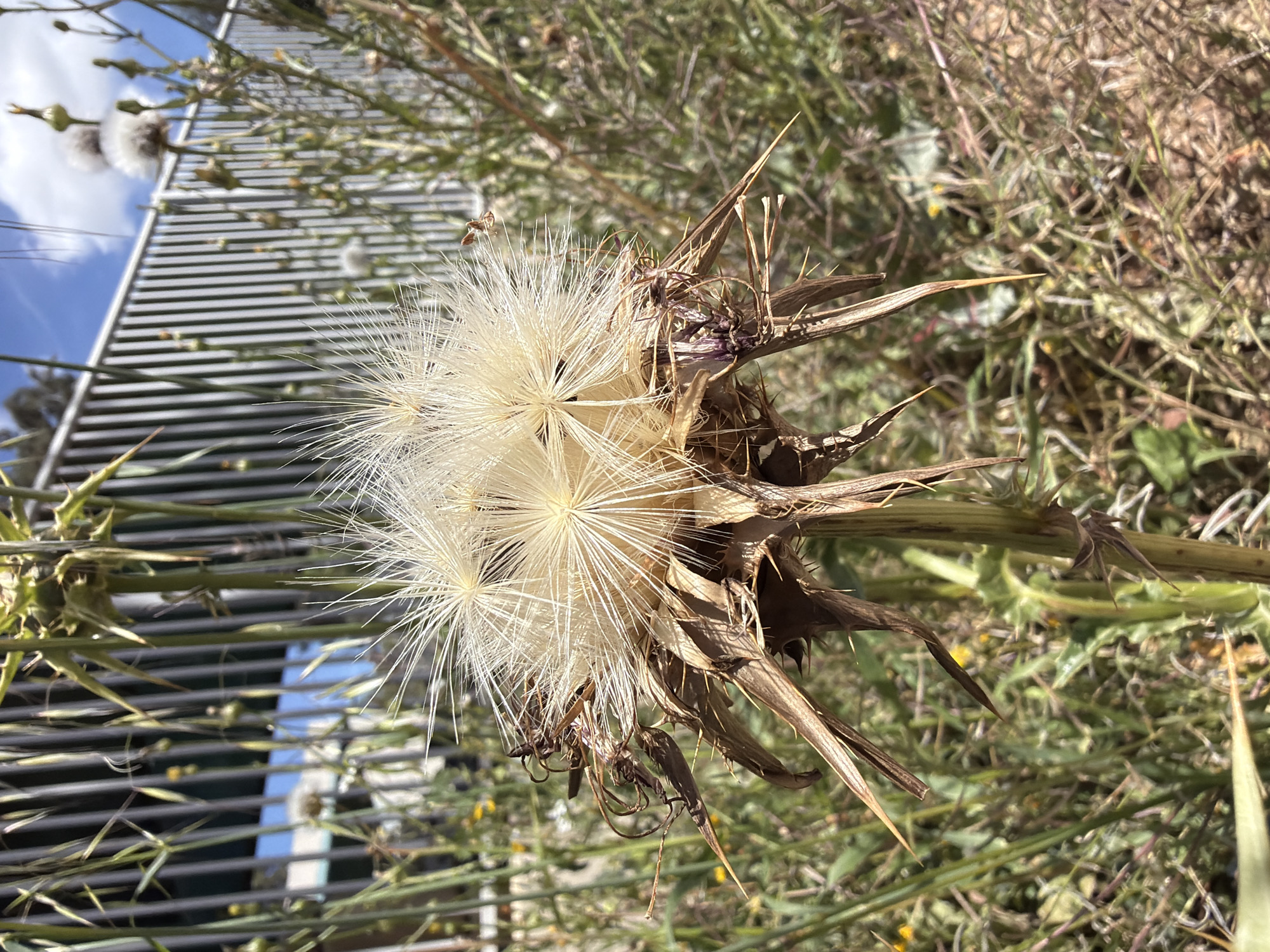 close-up view of a cluster of dry thistle flowers in Eshkol Regional Council, Israel. The thistle heads have gone to seed, and their seedheads appear as light-colored, fluffy spheres. Surrounding the fluffy seedheads are dried, spiky bracts typical of thistle plants. The stem of the thistle is visible, also appearing dry and bearing remnants of leaves or other plant matter. The background includes blurred vegetation, as well as a view of a slatted structure, suggesting a fence or building, with a glimpse of blue sky.