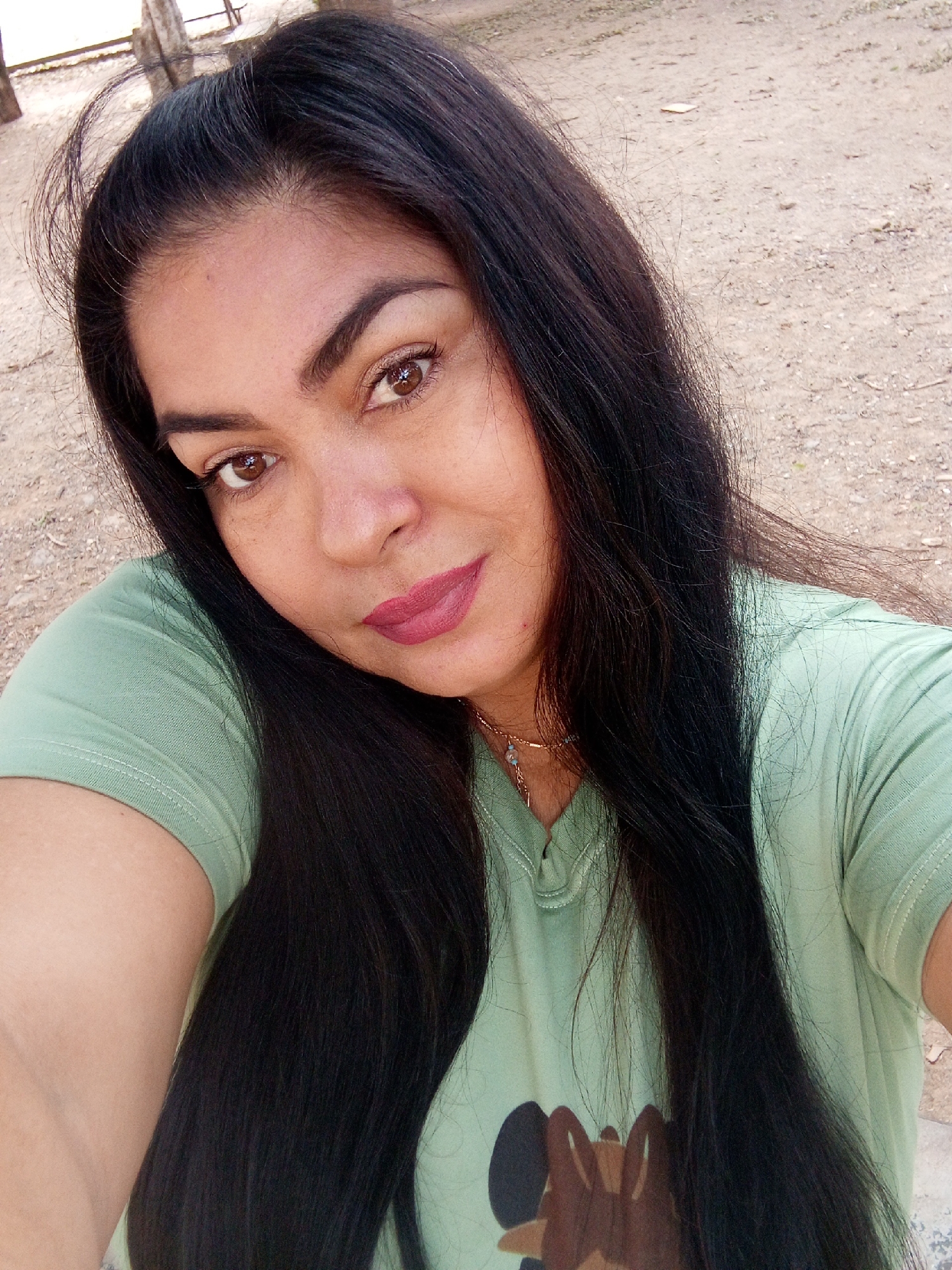 A woman is taking a selfie outdoors. She has dark hair, brown eyes, and is wearing a green t-shirt. There is a sandy ground visible in the background. The location is potentially Las Piedras, Venezuela.