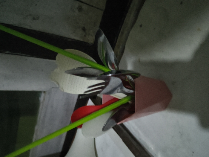 The image depicts a static indoor scene in the city of Tarqumiyah, Palestinian Territory. In the foreground, a pink, faceted container holds an assortment of items. These include several green, cylindrical sticks/straws, multiple pieces of metallic silverware (forks and spoons), a red heart-shaped object, and an off-white, textured, heart-shaped cutout. A metallic, leaf-like decorative element is also visible within the container. The container rests on a light-colored, flat surface that shows subtle texture and cast shadows. The background is dimly lit and out of focus, revealing a dark rectangular area suggestive of a window or opening, bordered by a lighter horizontal ledge. A textured, light-colored vertical structure, possibly a column or wall segment, is visible on the right. No individuals or specific actions are depicted.