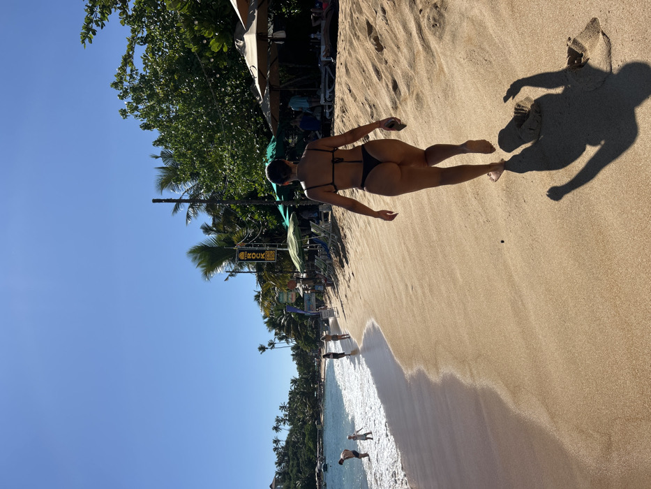 The image displays a sunny beach scene in Rumassala, Sri Lanka. A female individual, viewed from behind, walks barefoot on light brown sand, moving towards the upper right side of the frame. She is wearing a black two-piece swimsuit, consisting of a thong-style bottom and a strappy top. A light-colored object is held in her right hand. Her shadow, elongated by the sun, is cast on the sand in the foreground. To the left, the clear blue ocean extends, featuring gentle white-capped waves breaking along the shoreline. Several individuals are present near the water's edge; one adult male is partially submerged and bending forward, accompanied by a small child. Further down the beach, two other figures stand near the water. The background coastline is lined with dense green foliage, including numerous palm trees. Along the right side of the beach, a series of commercial establishments are visible, indicated by multiple beach umbrellas (some green, some beige) and beach loungers. Indistinct figures are seated or relaxing beneath these umbrellas. A prominent yellow vertical sign with black text, partially visible, displays "ROCK CAFE". The sky above is clear and bright blue.
