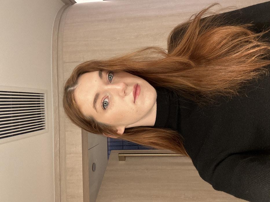 A fair-skinned woman with auburn hair and light eyes poses for a portrait. She wears a black turtleneck sweater. The background appears to be an interior space with beige walls and a vent with horizontal slats on the left. A portion of a cabinet or countertop is visible, suggesting the setting might be a kitchen or bathroom. The woman's face is angled slightly towards the camera, displaying a subtle, neutral expression. The photo appears to be taken in portrait mode.