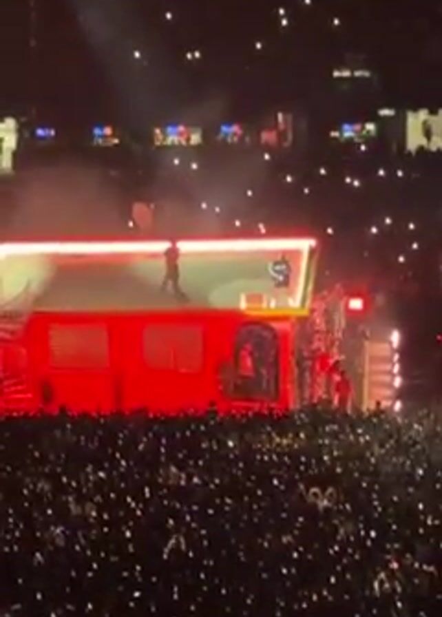 A person stands on the roof of a red structure during a concert. The red structure resembles a house, complete with visible windows and an illuminated white rooftop. Surrounding the red structure is a sea of concertgoers. The audience members hold up illuminated objects such as cell phones. The stadium itself is visible in the background, with lights also visible from above.