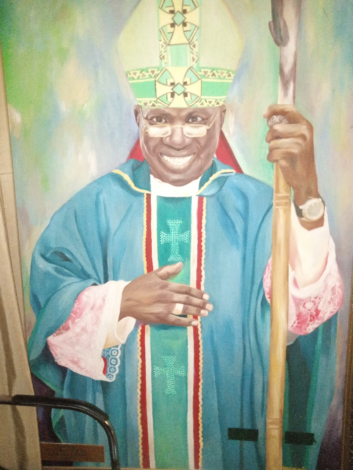 This image is a full-color portrait painting depicting an adult male. The subject, an older dark-skinned male with a broad smile showing teeth, wears eyeglasses and traditional ecclesiastical vestments. He is adorned with a light blue/teal outer garment featuring a central green panel with two cross designs, bordered in red and gold. A patterned green and yellow mitre sits on his head. White under-sleeves with pink lace trim are visible. He holds a light brown wooden staff or crozier in his right hand (viewer's right), where a silver-toned wristwatch with a white face is present on his wrist. His left hand (viewer's left) is slightly raised with an open palm, featuring a gold-colored ring on the ring finger. The background is a softly blended, abstract composition of light green, blue, and white tones. In the bottom left corner, a portion of a dark-framed wooden chair is visible in the foreground. The image provides no visual information regarding its specific location within Kaduna, Nigeria.