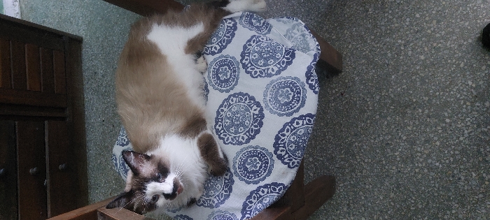 - "A Ragdoll cat sprawls across a round, blue and white patterned cushion placed on a wooden chair" by FM-MyThD2, licensed under CC BY 4.0