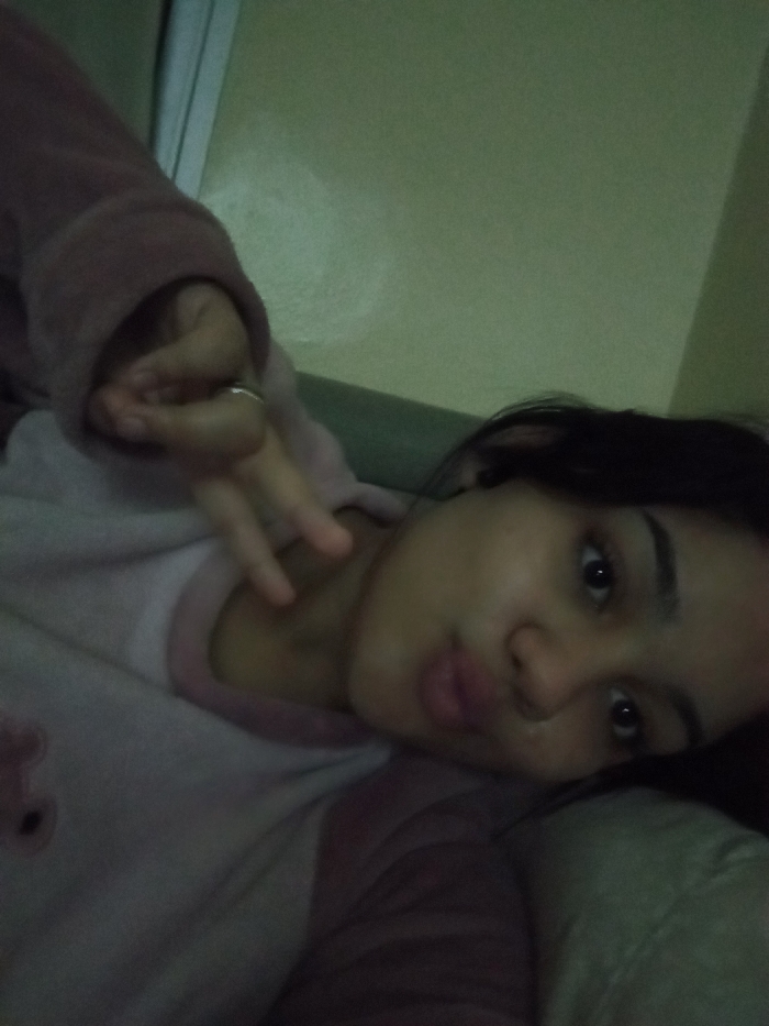 A young woman lies on a couch, angled towards the camera. She makes a peace sign with her right hand, which has a ring on one finger. She has dark hair and brown eyes. She wears a white and pink long-sleeved shirt. The background is a plain, light green wall, partially obscured by a window frame. The lighting is soft and even.