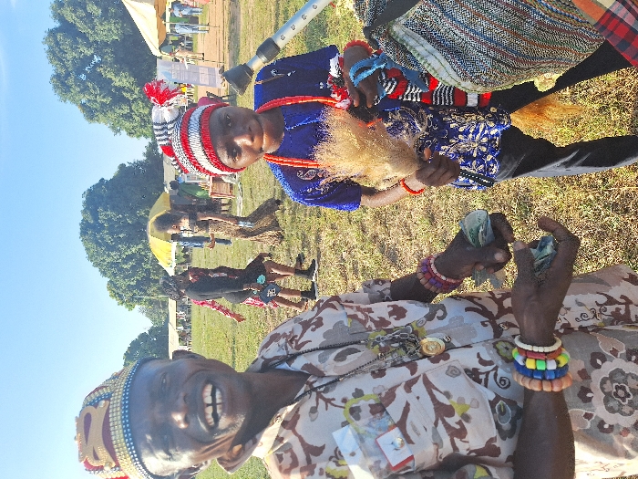 The image depicts an outdoor gathering in Barden Yana, Nigeria, under a clear blue sky. In the foreground, two individuals are positioned. On the left, an adult male with dark skin and a broad smile, showing his upper teeth, faces the camera. He wears a light-colored patterned short-sleeved shirt with camouflage-like and floral motifs. His head is adorned with a decorated hat featuring a red base, gold trim, and multi-colored embellishments. Around his neck, he wears several necklaces, one with a prominent circular gold-colored pendant. Both wrists are accessorized with multiple beaded bracelets of varying colors and sizes. He holds crumpled Nigerian Naira banknotes in each hand. A small transparent pouch or object is visible in his left shirt pocket. To the right, a younger individual, possibly a teenager or child, with dark skin, looks directly towards the camera. They wear a dark blue long-sleeved top with intricate gold and white embroidery. A distinctive knitted hat with white, red, and black stripes, topped by a red and white pompom, covers their head. Multiple strands of red beaded necklaces adorn their neck, and a red bracelet is on their right wrist. The individual holds a light-brown, feathery or fibrous whisk-like object in their right hand. A woven bag with multi-colored stripes is partially visible on their left side. A black cylindrical object, possibly a camera monopod or tripod leg, is positioned behind and to the right of this individual. In the mid-ground, several blurred figures are visible moving across a grassy field. A bright yellow canopy or umbrella is present, along with multiple white tent structures, suggesting an event or market setting. The far background features large, mature green trees beneath the clear sky.