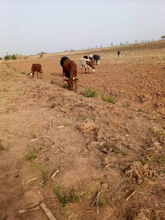 A dry, undulating field is populated by grazing cattle. Several cows, brown and patterned, are clustered in the middle distance, heads down eating scarce vegetation. A lone brown calf grazes near the edge of the field. The ground is mostly bare, with scattered stubble and small patches of green growth. The sky is overcast, casting a muted light over the landscape. White birds are visible among the cattle in the distance.