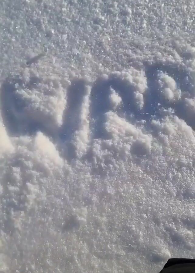 word "WAR" written in snow. The word is then disturbed, with a stick used to erase it by moving the snow. A small piece of a stick is visible on the snow, lying on its surface. A person's pants are seen in the lower right corner of the frame. A child's voice is audible. The environment is a snow-covered area, possibly outside.