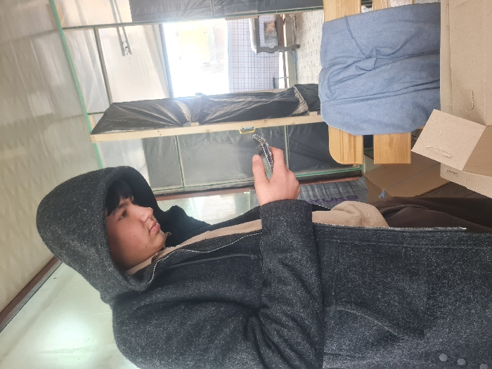 A person in a hooded gray coat is looking to the left. They are holding something metallic in their right hand. Behind the person are stacked shelves covered in dark material. To the right is a blue cushion on a wooden frame, and partially opened cardboard boxes. The scene is bathed in natural light filtering through a window, creating a relaxed indoor setting.