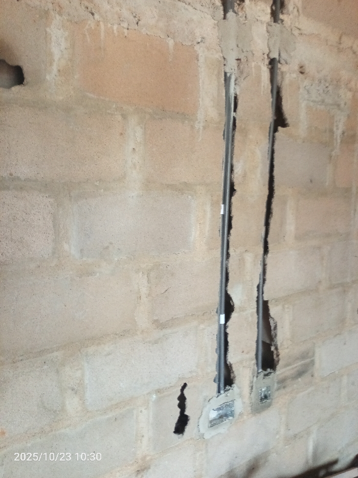 The image displays an interior concrete block wall in a building under construction or renovation, potentially located in Enugu, Nigeria. The wall consists of light-colored, unpainted concrete blocks with visible mortar joints. Two vertical channels are carved into the wall, each approximately 2-3 inches wide, housing gray electrical conduits. These conduits are embedded into the channels, with small white markers or tape pieces affixed to them at intervals. At the bottom of each channel, a rectangular electrical outlet box is recessed into the wall and partially secured with fresh, light-gray cement or plaster. The left box appears to be a single-gang unit, while the right is a double-gang unit. The surrounding wall surface exhibits rough-cut edges and textured variations typical of construction. No individuals are visible. A digital timestamp "2025/10/23 10:30" is present in the lower-left corner. Specific identification of a precise location within Enugu is not possible based solely on the visual information provided.