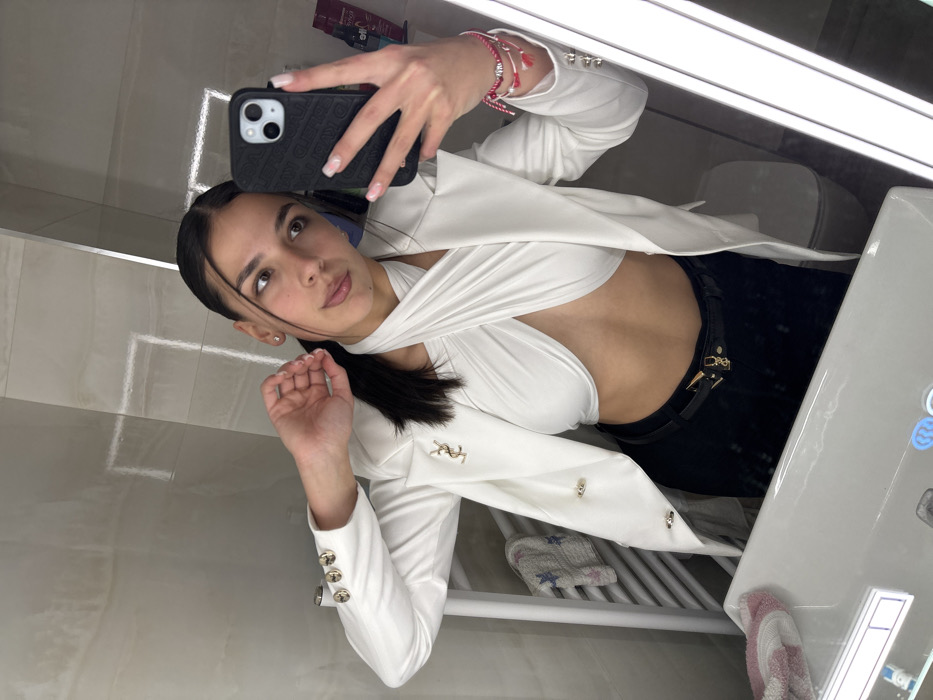 The scene is a modern bathroom. The specific location within Gabrovo, Bulgaria, cannot be determined from the visual evidence. One female subject, appearing to be a young adult with dark hair pulled back into a low ponytail, is depicted. She has light skin, subtle makeup, and a small stud earring in her right ear. She is wearing a white long-sleeved blazer with gold-colored buttons on the cuffs and lapels, and a gold-colored 'YSL' logo pin on the left lapel. Underneath the blazer, she wears a white crisscross halter crop top that exposes her midriff, paired with dark-colored trousers secured by a black belt with a gold-colored buckle. Her left wrist displays multiple red and white string bracelets, and her fingernails are shaped with French tips. The subject is capturing a mirror selfie using a dark-colored smartphone with a dual-lens camera system, held in her right hand. Her left hand is positioned near her head, slightly touching her hair. Her gaze is directed slightly off-camera to her right. The bathroom features large light-colored wall tiles, a white ceramic vanity sink, and a vertical mirror flanked by illuminated LED strips. A white ladder-style towel warmer with a white and patterned towel is visible to the left of the subject. A white toilet and several bath product containers are partially visible in the background reflection.