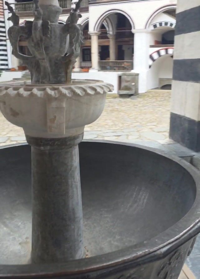 stone fountain in a courtyard of a building complex. The fountain has a large, dark metal basin, a stone pedestal, and a smaller, decorative upper section with small figures. The courtyard is paved with stone. Behind the fountain, the buildings have a multi-level colonnade structure with white arches and dark wood railings. Some pillars have black and white stripes. A few people walk in the background.