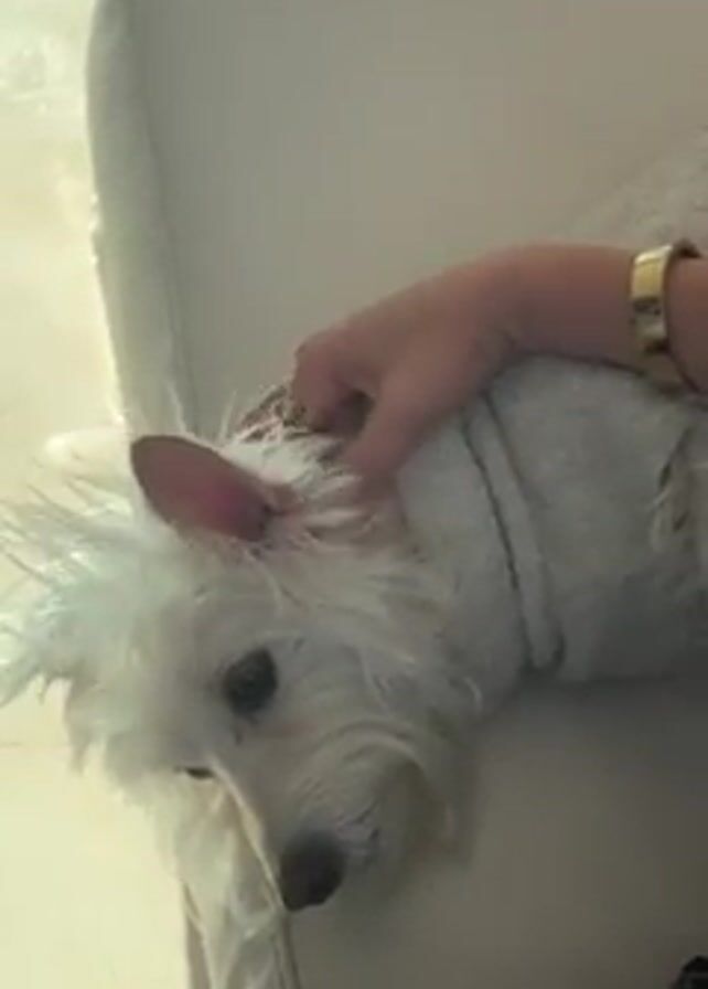 A small white dog, possibly a West Highland White Terrier, is lying on a white leather couch. The dog is wearing a light gray garment that appears to be a sweater or towel. A hand with a gold bracelet is petting the dog's head. The dog lifts its head slightly and appears to pant. A person is sitting next to the dog, visible from the knees down. A cell phone is on their lap displaying a messaging app. The scene is brightly lit by natural light.